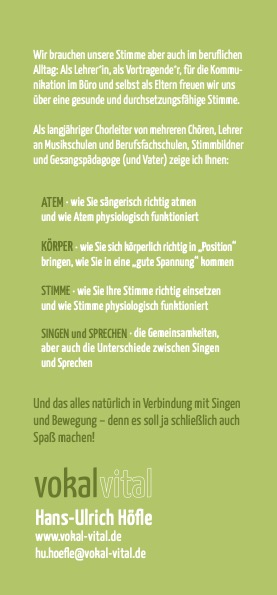 Mein größtes Anliegen ist es, ganz normalen Sänger – ob sie am Anfang stehen oder schon jahrelang singen – den richtigen Umgang mit ihrer Stimme näher zu bringen. Und das Schöne daran ist, dass man dabei selbst immer wieder dazulernt. Wenn Du also einen Chor suchst, in dem Du mitsingen kannst oder einen Chor oder eine Gruppe hast, der/die sich in Sachen Stimme weiterentwickeln möchte, kannst Du dich gerne mit mir in Verbindung setzten http://www.vokal-vital.de